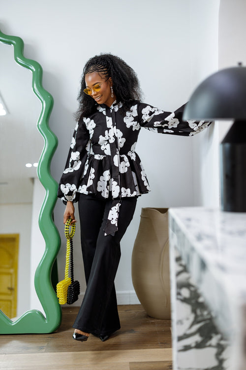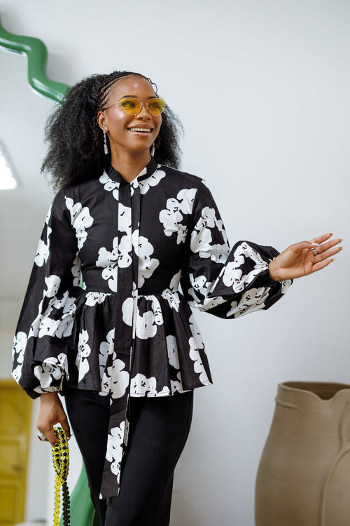 BIBI AFRICAN PRINT TIE NECK PEPLUM TOP [BLACK]
